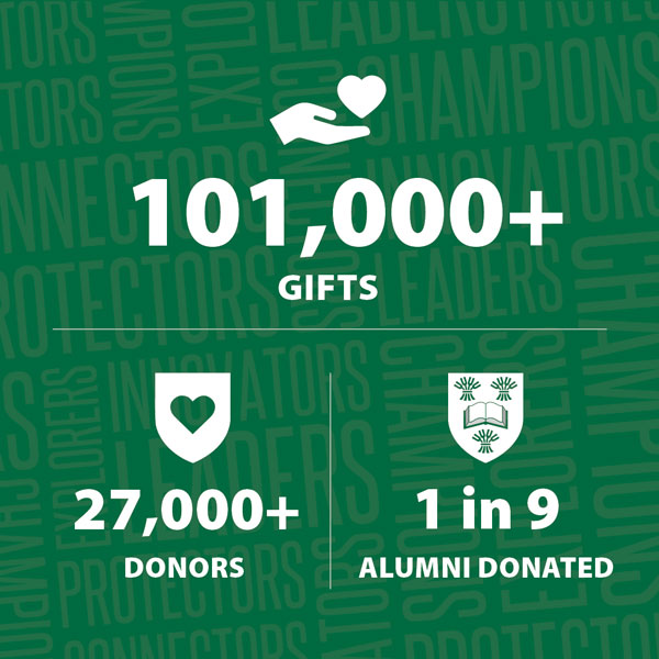 Throughout this campaign, more than 27,000 donors, including one in nine USask alumni, made more than 101,000 gifts ranging from individual contributions to large corporate donations. Of the total number of supporters, more than 10,500 were first-time donors to USask.