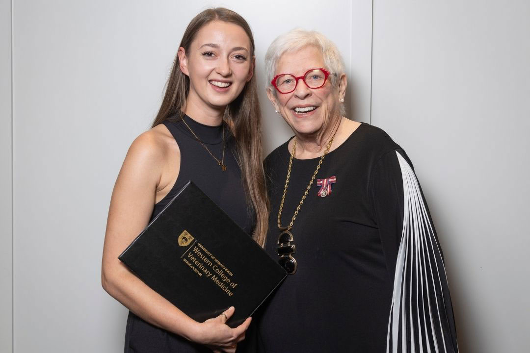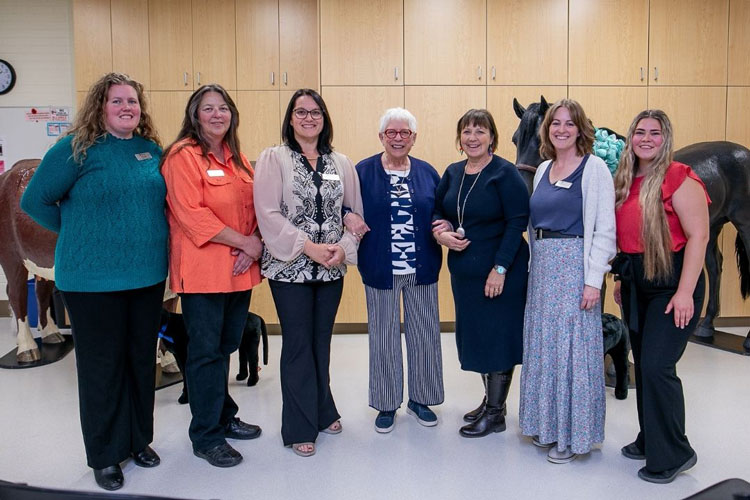 During a special ceremony on September 23, the WCVM and USask honoured Hughes for her extraordinary generosity. In the past 15 years, Hughes has donated over $1.29 million to the WCVM — supporting both the BJ Hughes Centre for Clinical Learning and her annual student scholarship at the veterinary college. The event celebrated her lasting impact on the college and her unwavering dedication to enhancing the learning environment for future veterinarians.